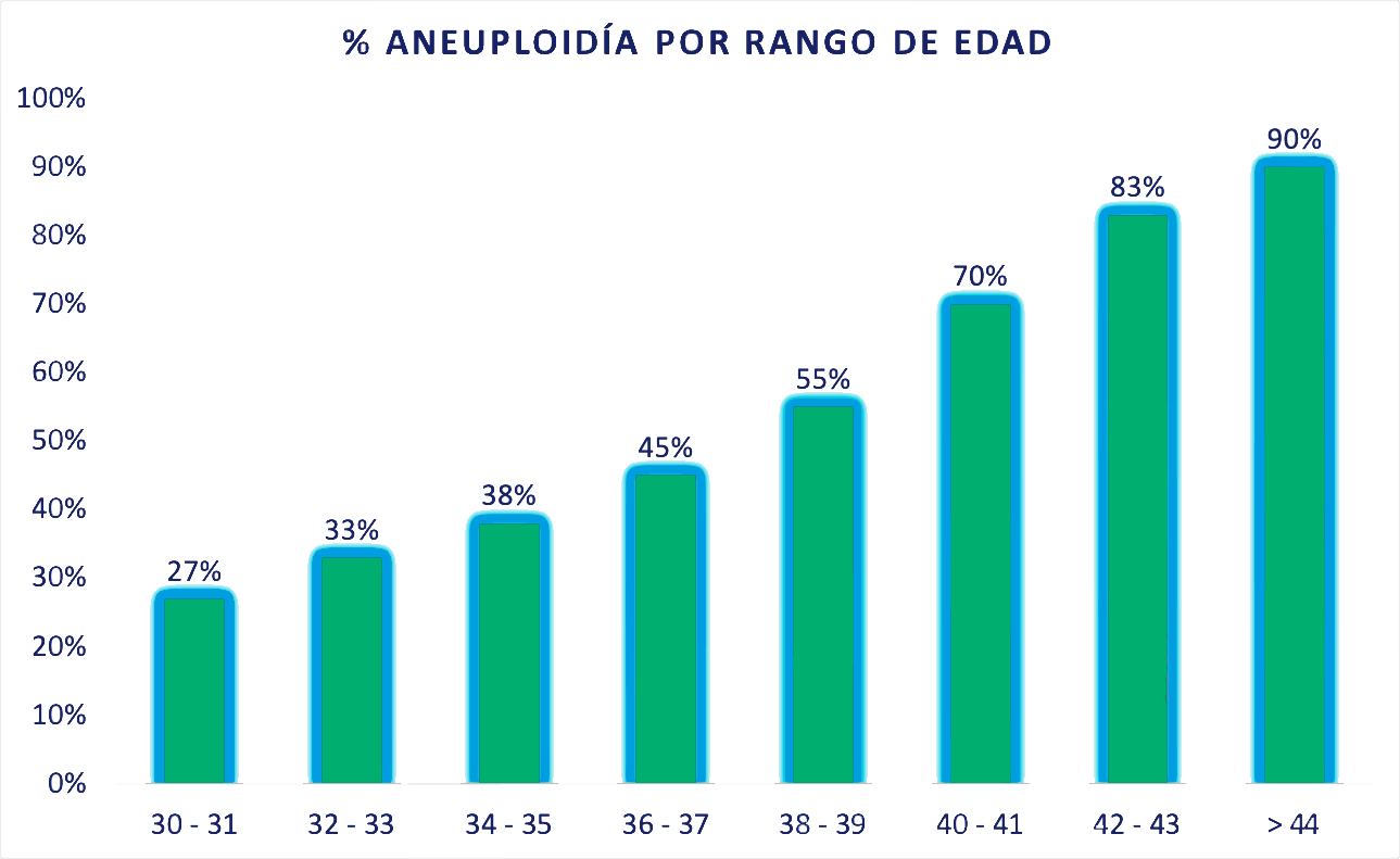 En la siguiente tabla podemos observar como se ven afectados los embriones según la edad. Aneuploidía se refiere a que el número de cromosomas es incorrecto, por lo tanto el embrión resultante no tiene capacidad de implantar y dar un bebé sano.